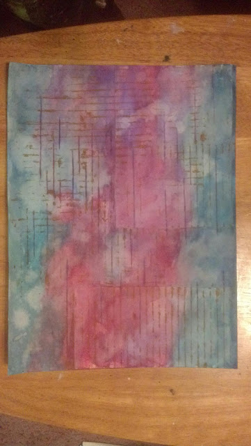 This piece was done with another paper I had previously inked an set aside for later. This was done when I accidentally tipped over my bottle of magenta acrylic ink. I didn't want to waste it, as this is my favorite of those inks, so I dipped a paper into it. On top of that I stamped circles with a candle lid, and rubbed them down to streak them. I also sprayed watered down acrylic ink to stain the paper dioxazine purple. My favorite part of this piece is the tearing I did to distress it, ripping only a layer of the paper away while it was still wet. I then glued the paper shred back in different pieces, and added a black wash to highlight the texture.